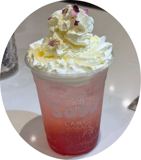 raspberry and strawberry soda topped with whipped creamREDEEM FREEBIES: CUPSLEEVE and 1 random character PHOTOCARD upon purchase of any drink/food from the Cafe!